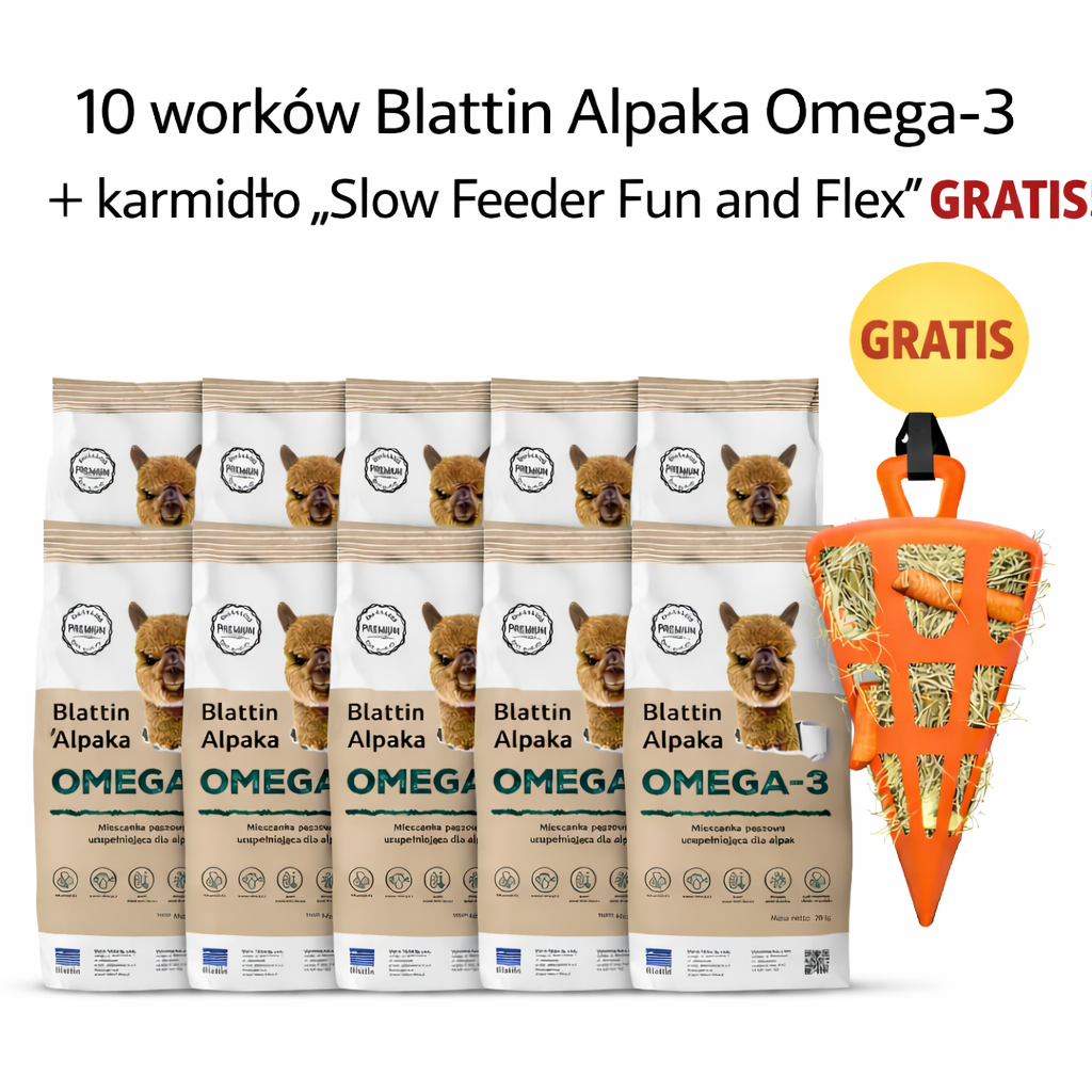 PROMOCJA!Kup 10 worków Blattin Alpaka Omega-3, a karmid艂o Slow Feed otrzymasz GRATIS 馃巵Zdrowe 偶ywienie, wolniejsze pobieranie paszy i zaj臋cie dla alpak w jednym pakiecie.Oferta ograniczona czasowo! 馃馃挌